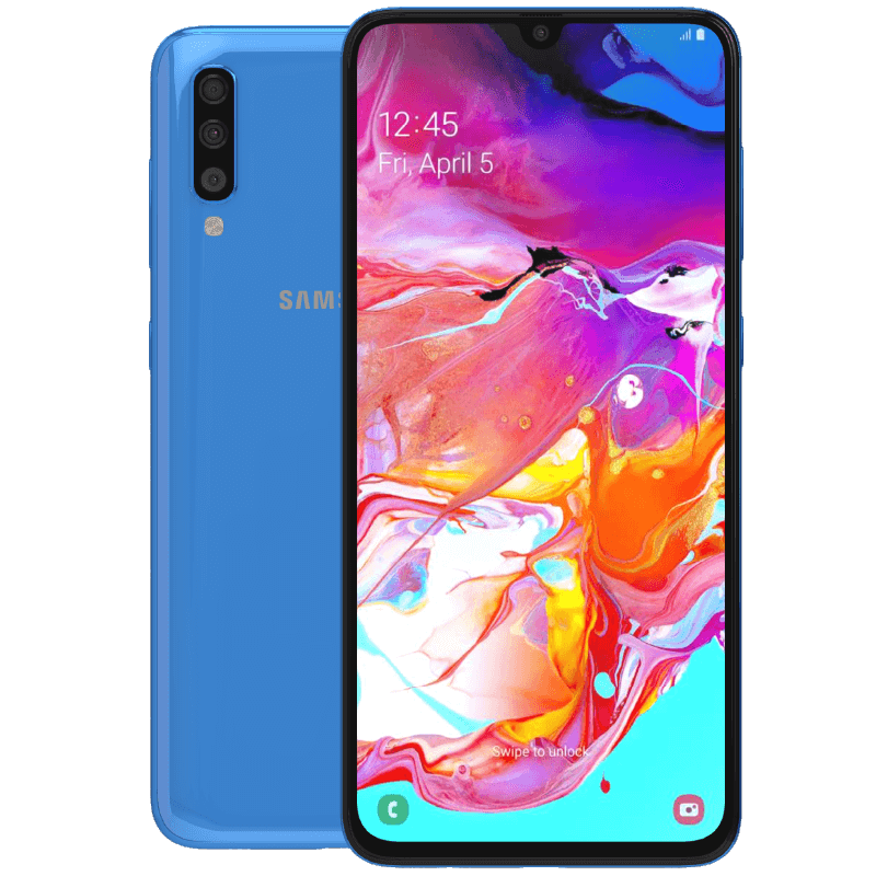 Samsung Galaxy A70 är en prisvärd smartphone som lanserades i maj 2019. Den har en slank design med en vikt på 183 gram och dimensioner på 164.3 x 76.7 x 7.9 mm. Telefonens kropp är byggd med en glasfront (Gorilla Glass 3), en plastbaksida och en plastinramning.